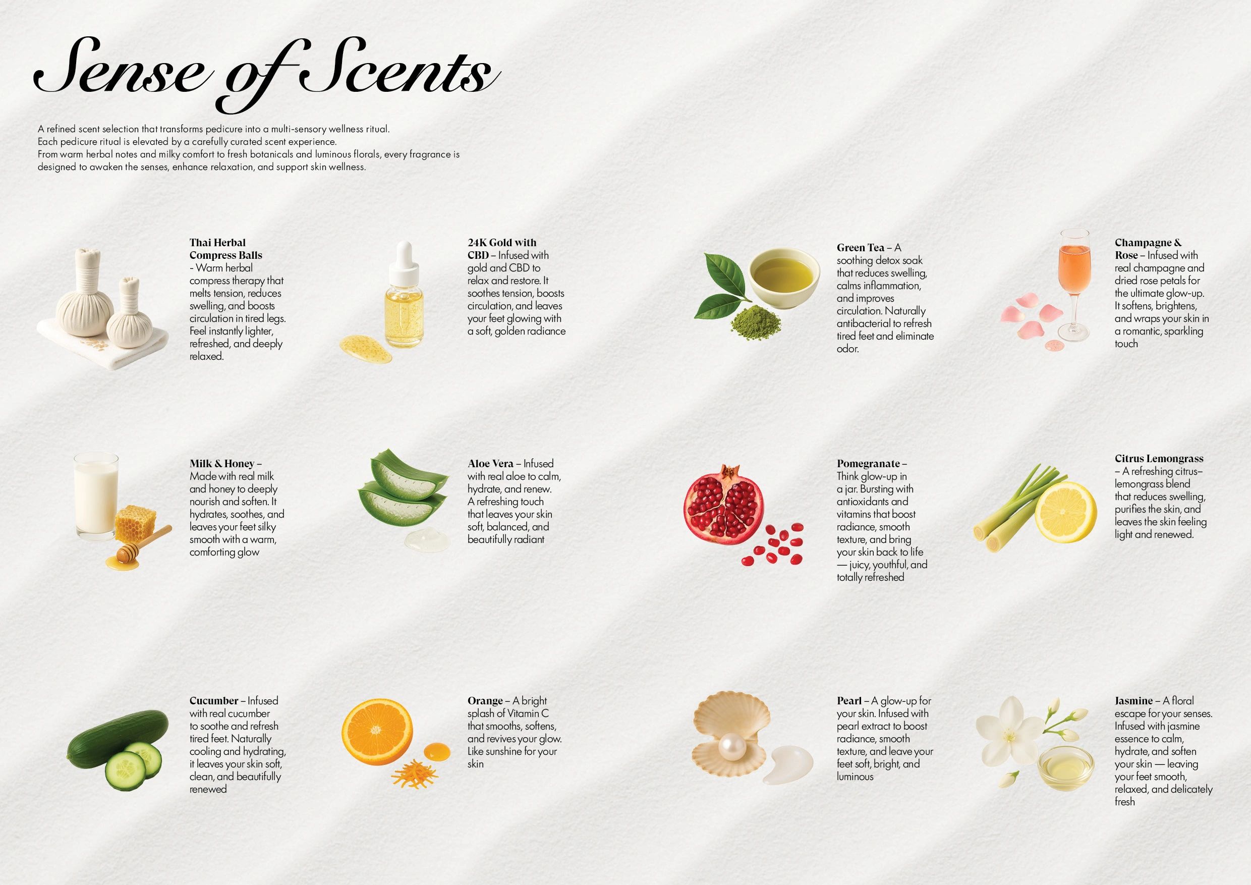 A revitalizing citrus pedicure powered by Vitamin C. Enjoy an orange sugar scrub, hydrating mask, nourishing lotion, and warm towels, combined with detailed nail and cuticle care. Leaves your feet soft, glowing, and beautifully refreshed.