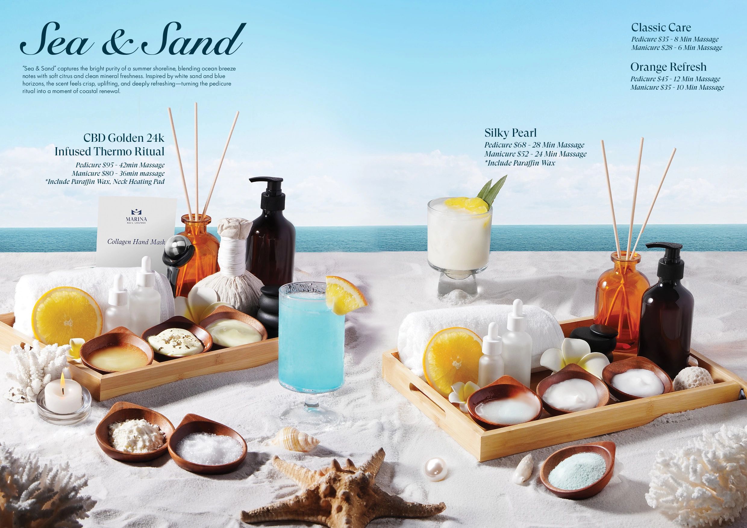 Prices: Pedicure & Manicure. Cold roller massage will be adjusted or mitted for clients with varicose veins to ensure comfort and safety. This menu will be effective starting March 1,2026.